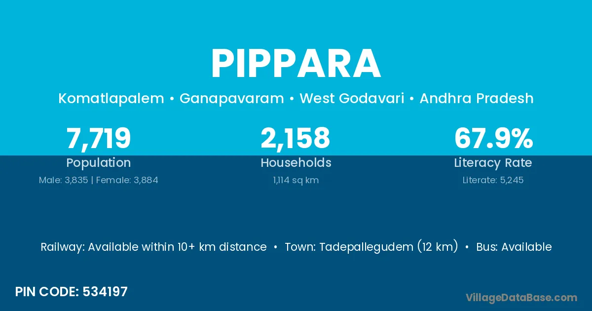 Tadepallegudem (12 km) is the nearest town to Pippara village for major economic activities and is located approximately 12 km away.