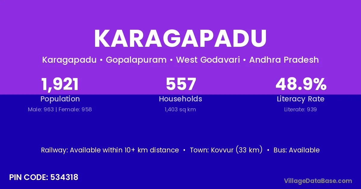 Karagapadu village has a total population of 1,921 people, of which 963 are males and 958 are females.