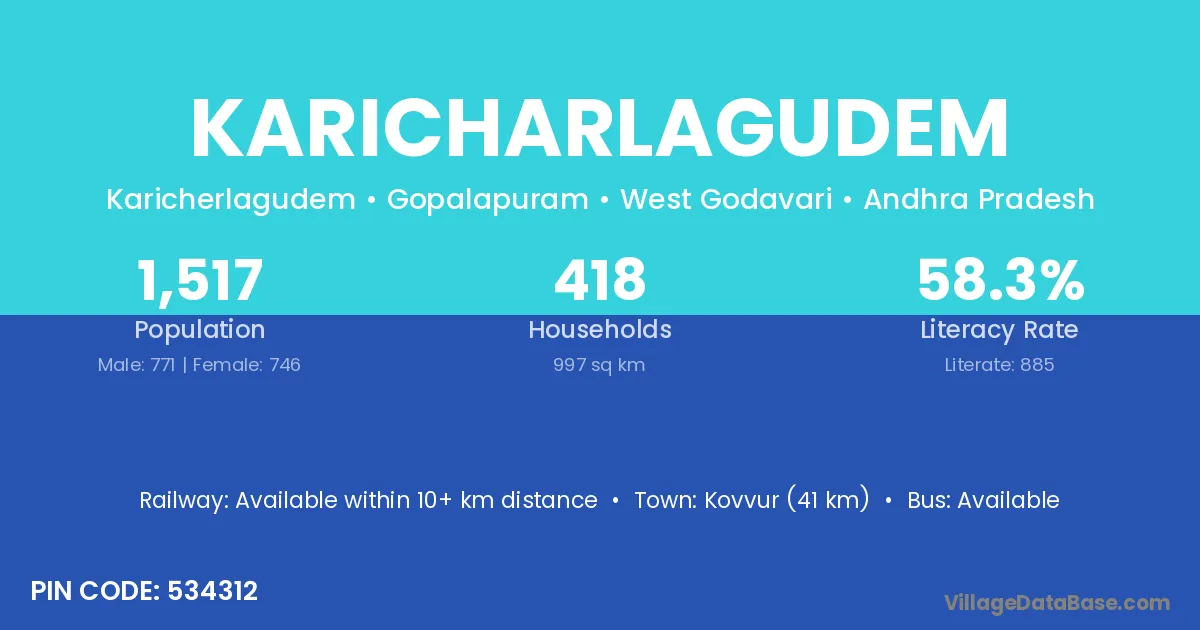 Karicharlagudem village has a total population of 1,517 people, of which 771 are males and 746 are females.