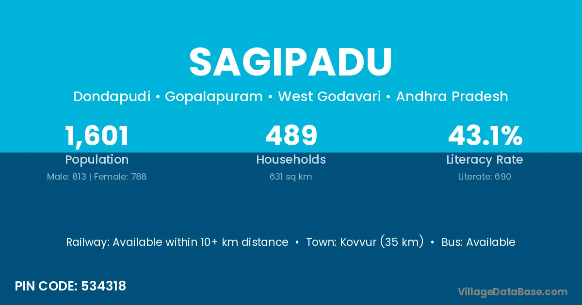 Kovvur (35 km) is the nearest town to Sagipadu village for major economic activities and is located approximately 35 km away.