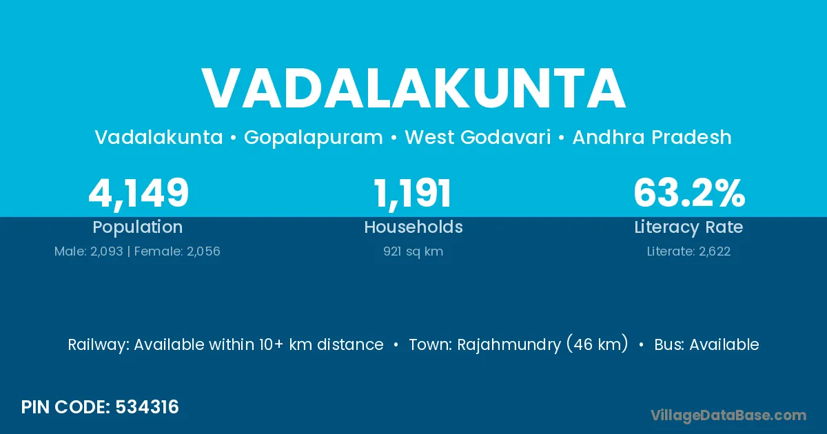 Rajahmundry (46 km) is the nearest town to Vadalakunta village for major economic activities and is located approximately 46 km away.