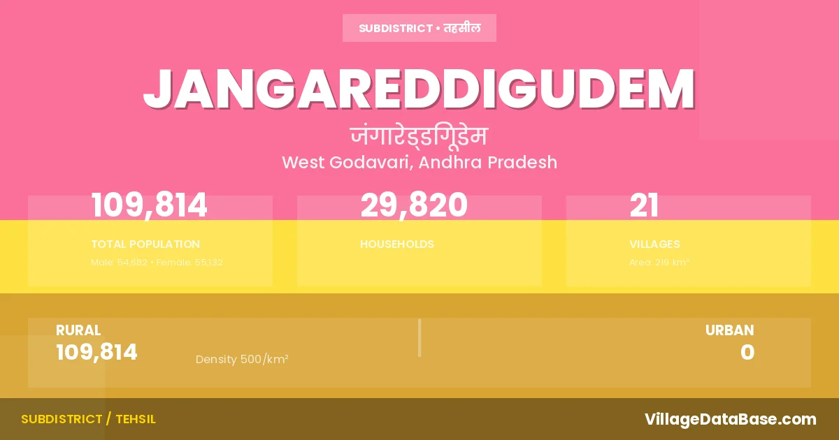 According to the 2011 census The total area of Jangareddigudem Mandal is 219 km², with a population of 109814 people. The population density is 500 inhabitants per square kilometre, and there are approximately 29820 houses in the sub district.