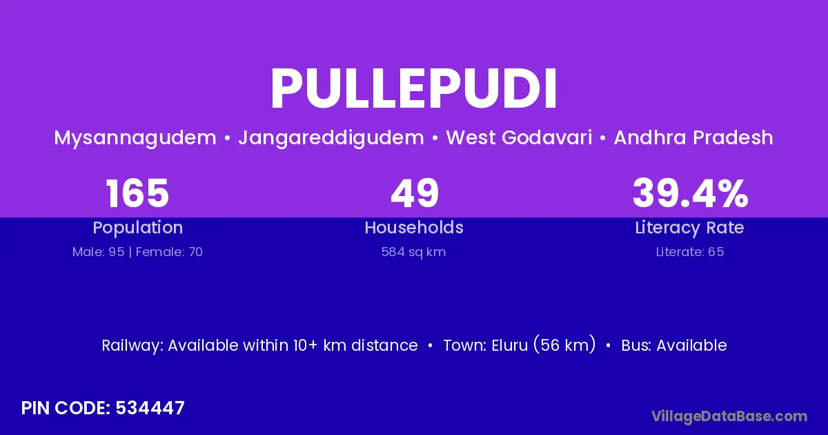 Eluru (56 km) is the nearest town to Pullepudi village for major economic activities and is located approximately 56 km away.