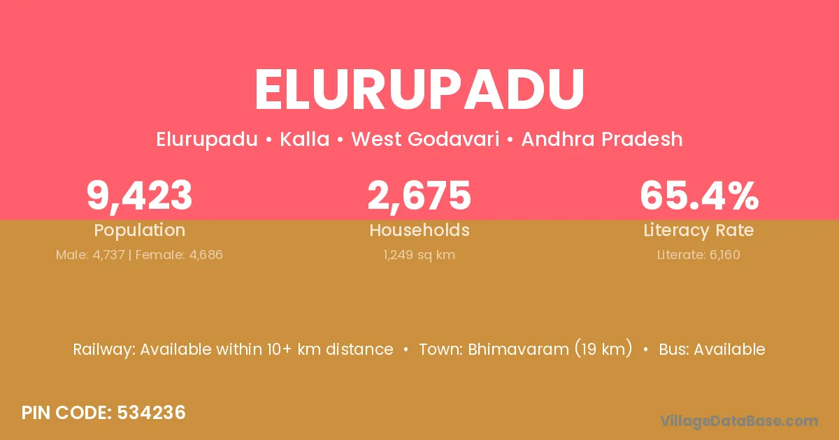Bhimavaram (19 km) is the nearest town to Elurupadu village for major economic activities and is located approximately 19 km away.