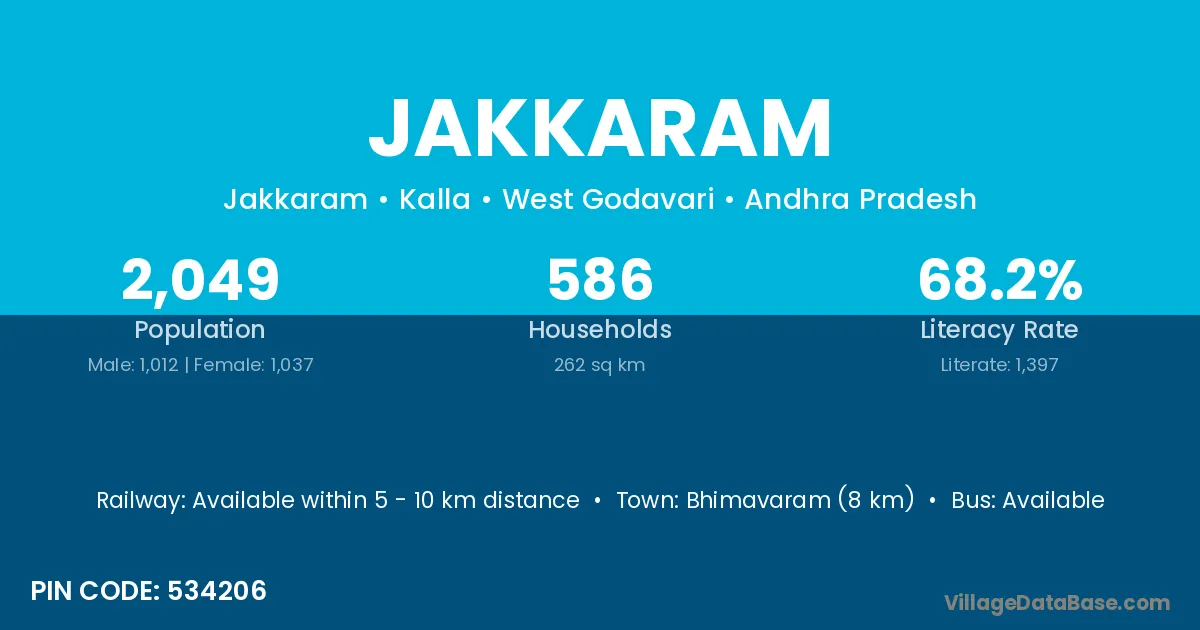 Bhimavaram (8 km) is the nearest town to Jakkaram village for major economic activities and is located approximately 8 km away.