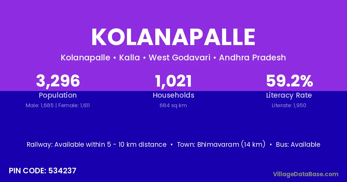 Bhimavaram (14 km) is the nearest town to Kolanapalle village for major economic activities and is located approximately 14 km away.