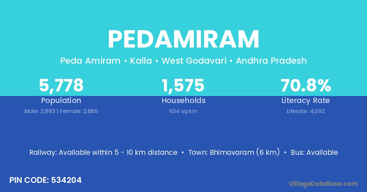 Bhimavaram (6 km) is the nearest town to Pedamiram village for major economic activities and is located approximately 6 km away.