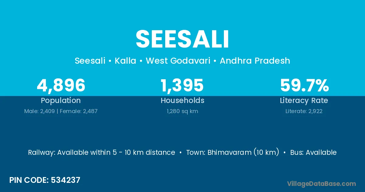 Bhimavaram (10 km) is the nearest town to Seesali village for major economic activities and is located approximately 10 km away.
