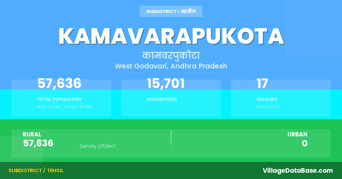 According to the 2011 census The total area of Kamavarapukota Mandal is 212 km², with a population of 57636 people. The population density is 271 inhabitants per square kilometre, and there are approximately 15701 houses in the sub district.