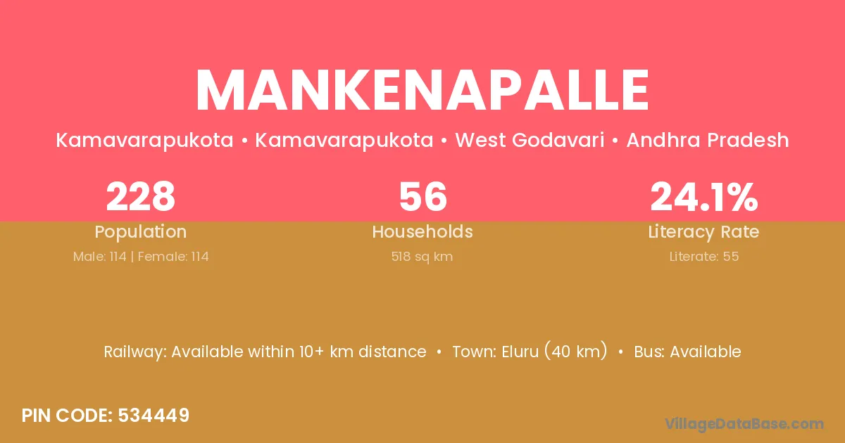 Mankenapalle village has a total population of 228 people, of which 114 are males and 114 are females.
