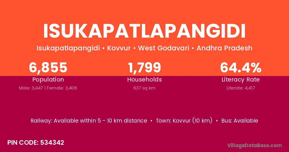 Isukapatlapangidi village has a total population of 6,855 people, of which 3,447 are males and 3,408 are females.