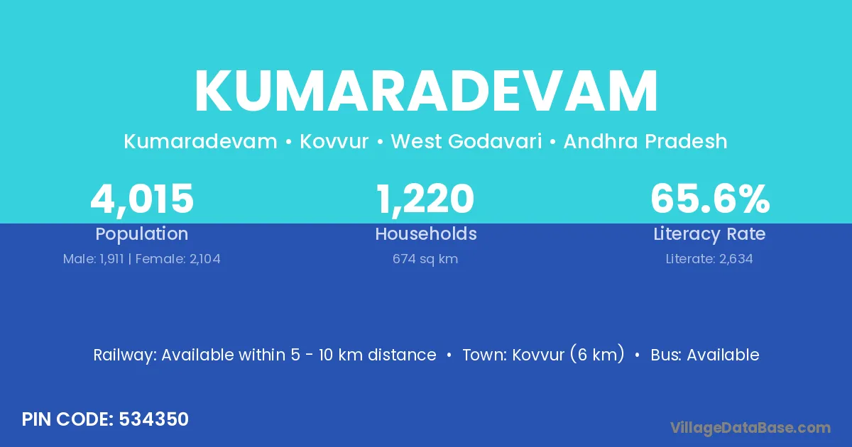 Kovvur (6 km) is the nearest town to Kumaradevam village for major economic activities and is located approximately 6 km away.