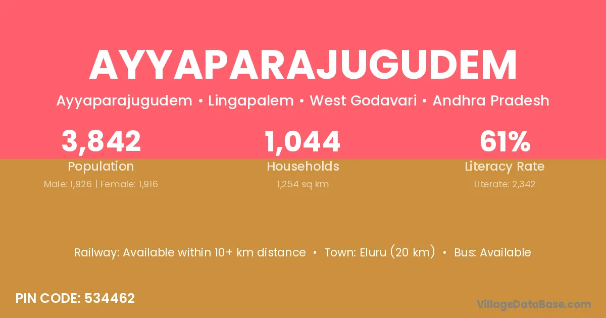 Ayyaparajugudem village has a total population of 3,842 people, of which 1,926 are males and 1,916 are females.