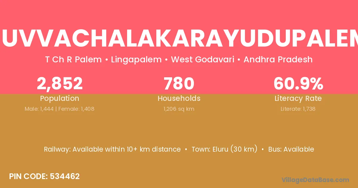 Eluru (30 km) is the nearest town to Juvvachalakarayudupalem village for major economic activities and is located approximately 30 km away.