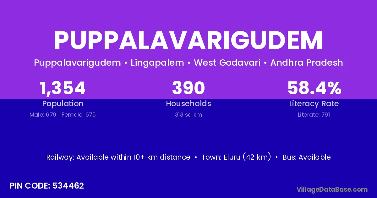 Eluru (42 km) is the nearest town to Puppalavarigudem village for major economic activities and is located approximately 42 km away.