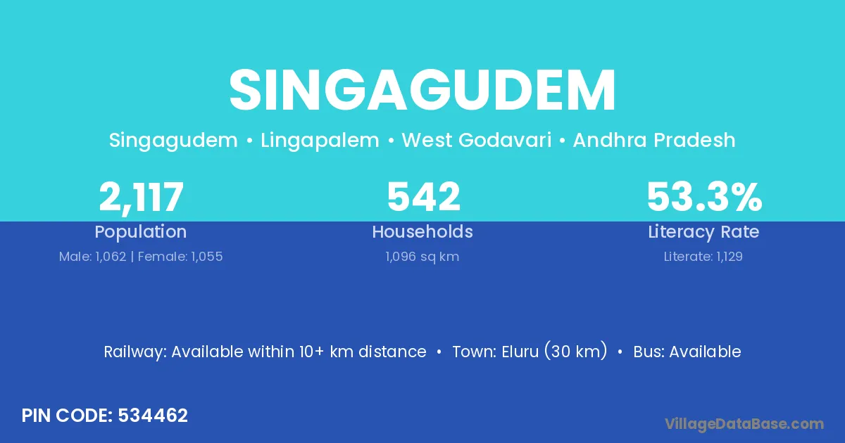 Eluru (30 km) is the nearest town to Singagudem village for major economic activities and is located approximately 30 km away.