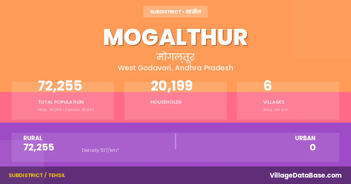 According to the 2011 census The total area of Mogalthur Mandal is 140 km², with a population of 72255 people. The population density is 517 inhabitants per square kilometre, and there are approximately 20199 houses in the sub district.