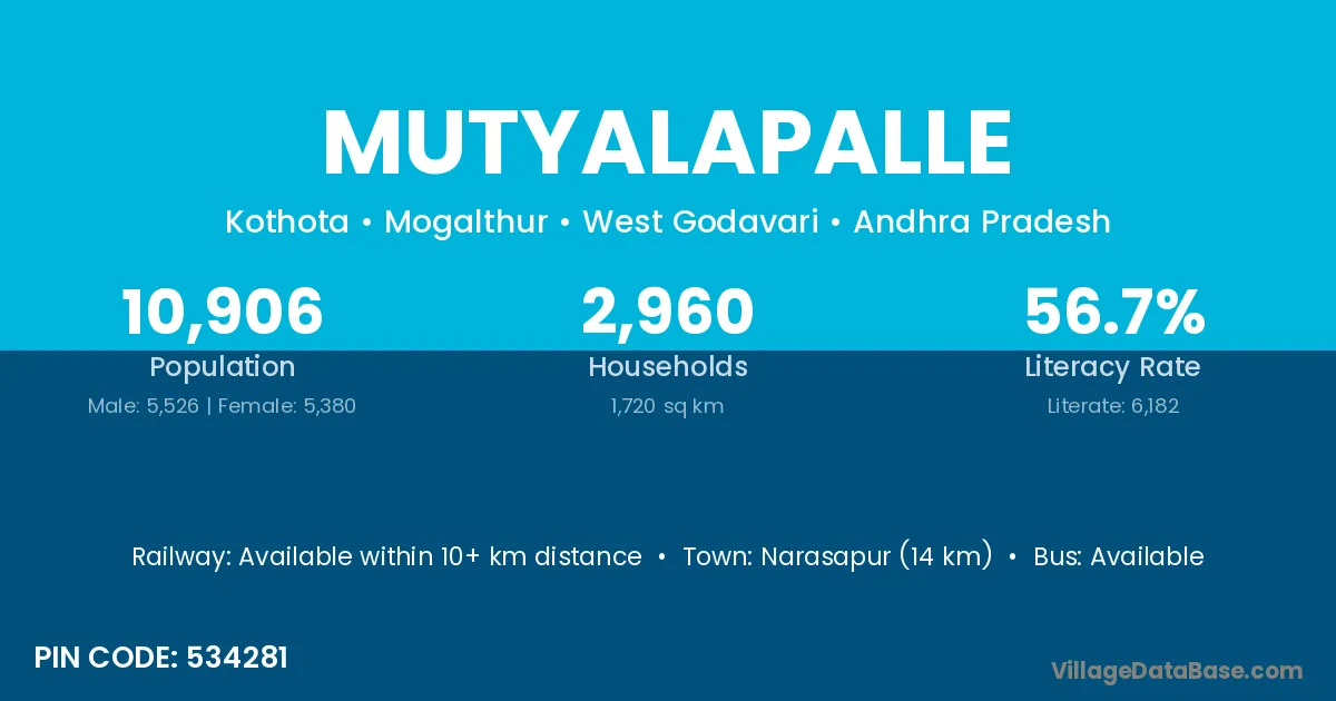 Narasapur (14 km) is the nearest town to Mutyalapalle village for major economic activities and is located approximately 14 km away.