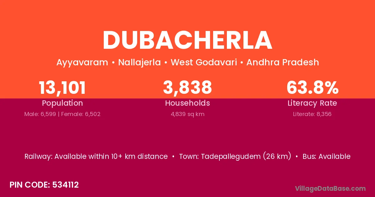 Tadepallegudem (26 km) is the nearest town to Dubacherla village for major economic activities and is located approximately 26 km away.