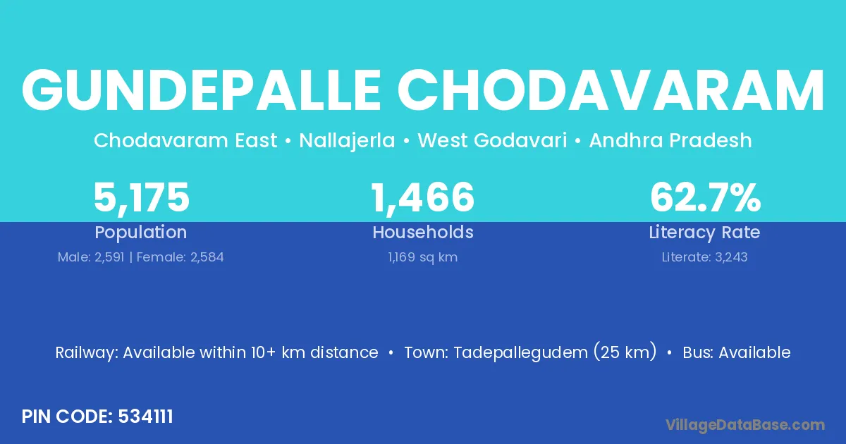 Tadepallegudem (25 km) is the nearest town to Gundepalle Chodavaram village for major economic activities and is located approximately 25 km away.
