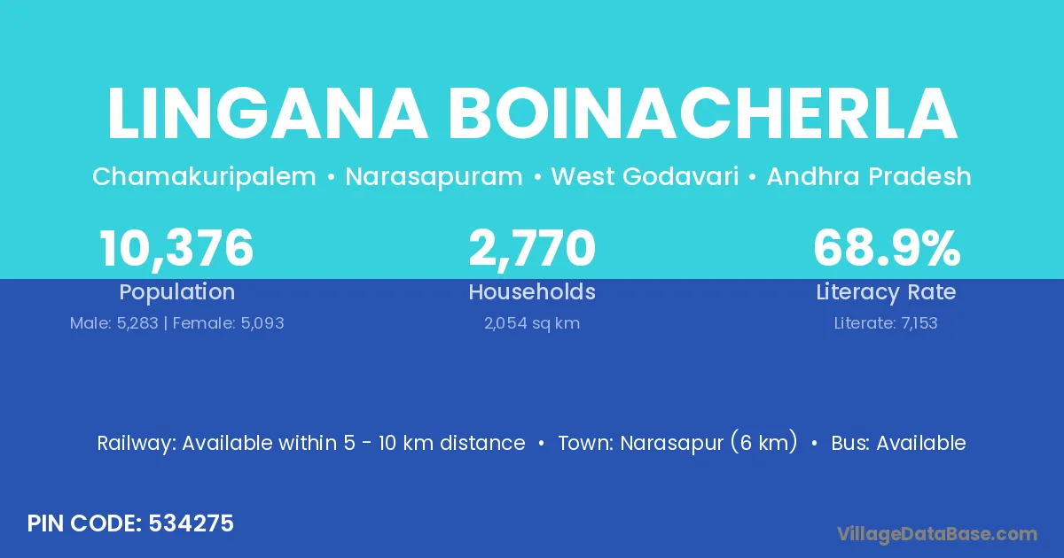 Narasapur (6 km) is the nearest town to Lingana Boinacherla village for major economic activities and is located approximately 6 km away.