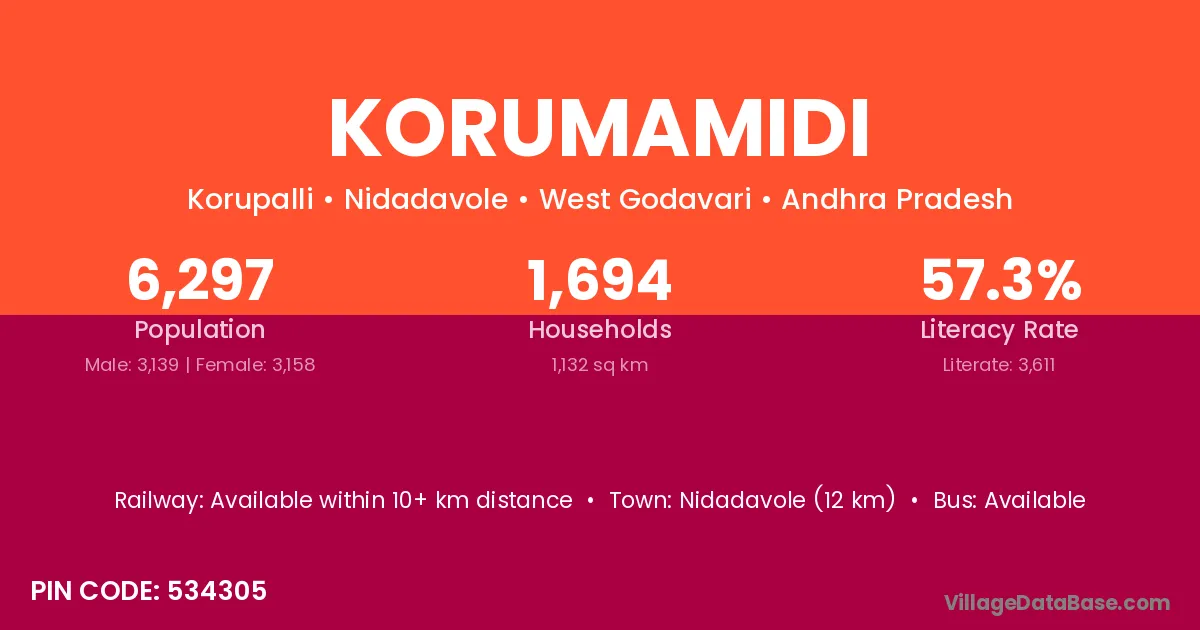 Nidadavole (12 km) is the nearest town to Korumamidi village for major economic activities and is located approximately 12 km away.