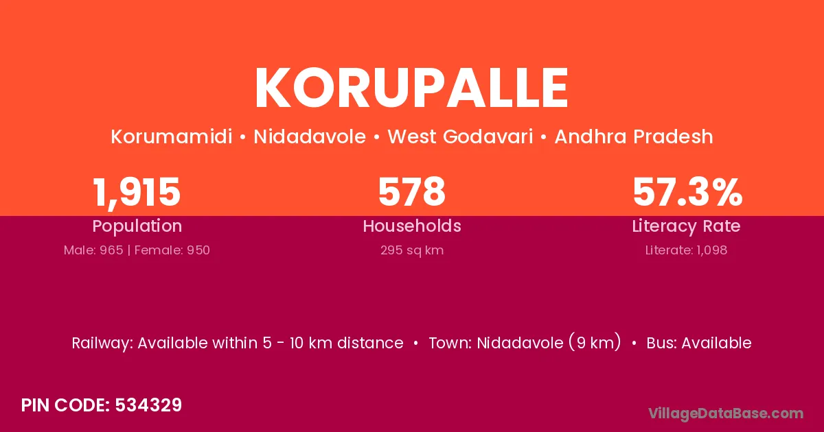 Korupalle village has a total population of 1,915 people, of which 965 are males and 950 are females.