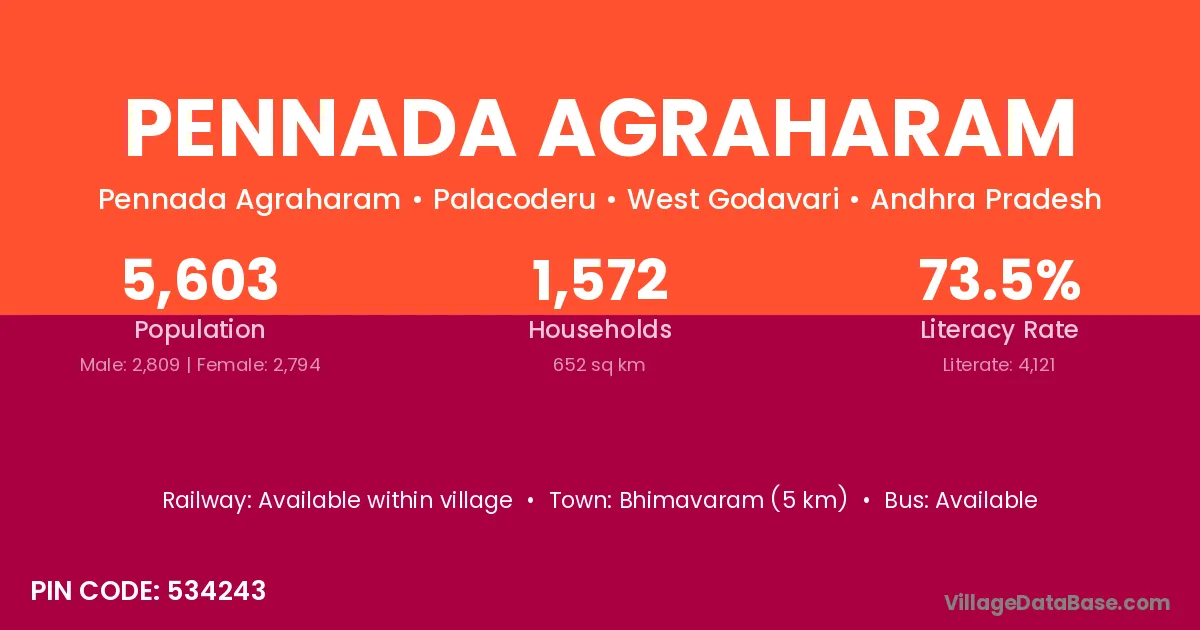 Bhimavaram (5 km) is the nearest town to Pennada Agraharam village for major economic activities and is located approximately 5 km away.