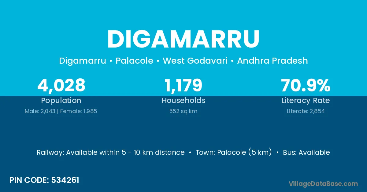 Palacole (5 km) is the nearest town to Digamarru village for major economic activities and is located approximately 5 km away.