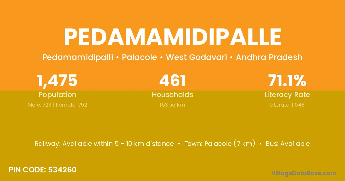 Palacole (7 km) is the nearest town to Pedamamidipalle village for major economic activities and is located approximately 7 km away.