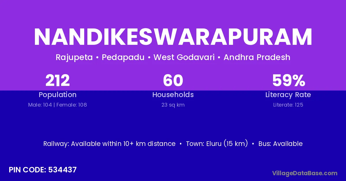 Eluru (15 km) is the nearest town to Nandikeswarapuram village for major economic activities and is located approximately 15 km away.