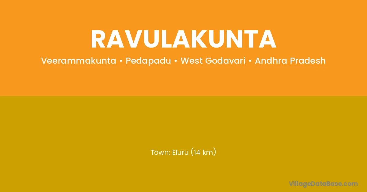 Eluru (14 km) is the nearest town to Ravulakunta village for major economic activities and is located approximately 14 km away.