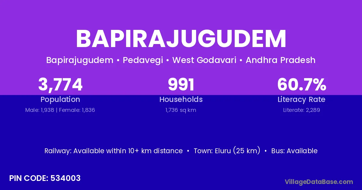 Bapirajugudem village has a total population of 3,774 people, of which 1,938 are males and 1,836 are females.