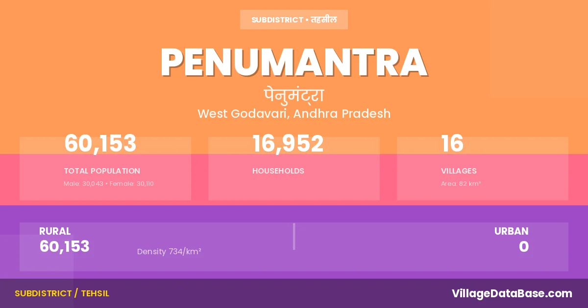 According to the 2011 census The total area of Penumantra Mandal is 82 km², with a population of 60153 people. The population density is 734 inhabitants per square kilometre, and there are approximately 16952 houses in the sub district.