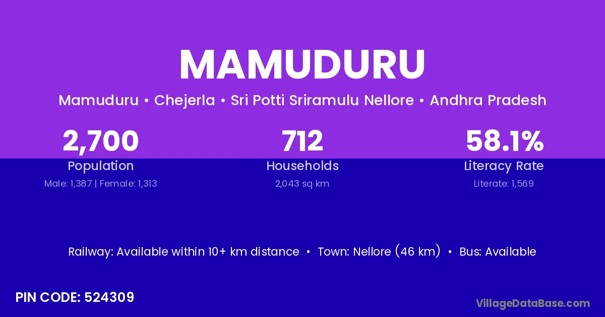 Mamuduru village has a total population of 4,487 people, of which 2,271 are males and 2,216 are females.
