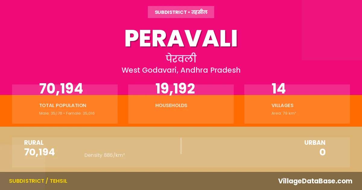 According to the 2011 census The total area of Peravali Mandal is 79 km², with a population of 70194 people. The population density is 886 inhabitants per square kilometre, and there are approximately 19192 houses in the sub district.