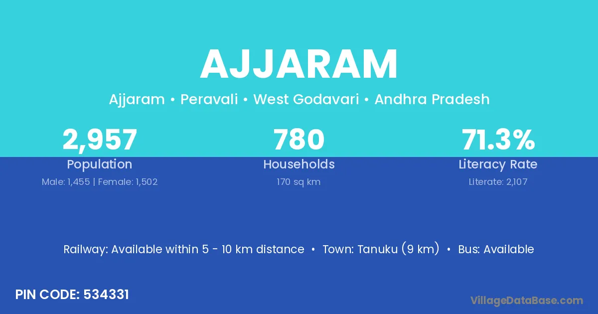 Tanuku (9 km) is the nearest town to Ajjaram village for major economic activities and is located approximately 9 km away.