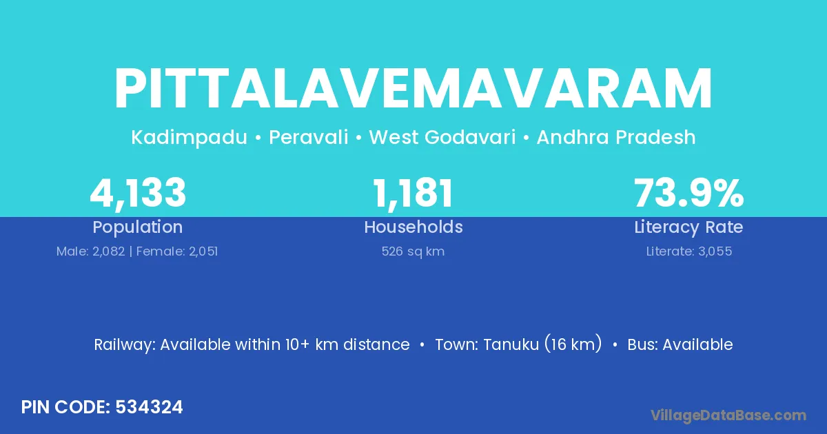 Tanuku (16 km) is the nearest town to Pittalavemavaram village for major economic activities and is located approximately 16 km away.