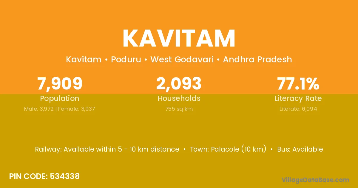 Palacole (10 km) is the nearest town to Kavitam village for major economic activities and is located approximately 10 km away.