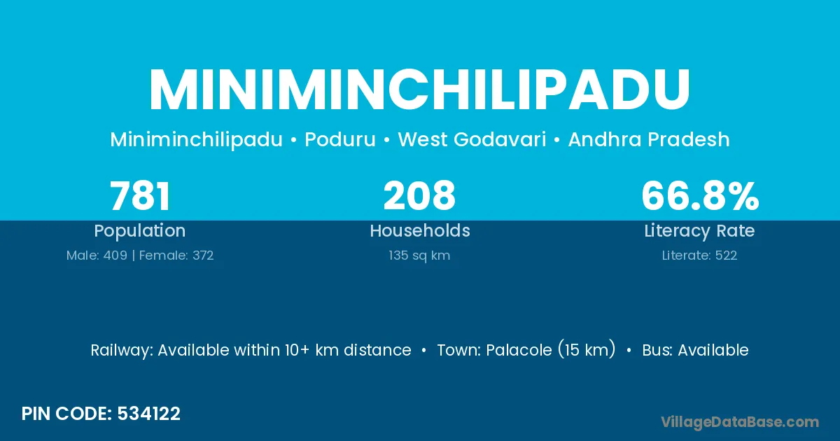 Palacole (15 km) is the nearest town to Miniminchilipadu village for major economic activities and is located approximately 15 km away.