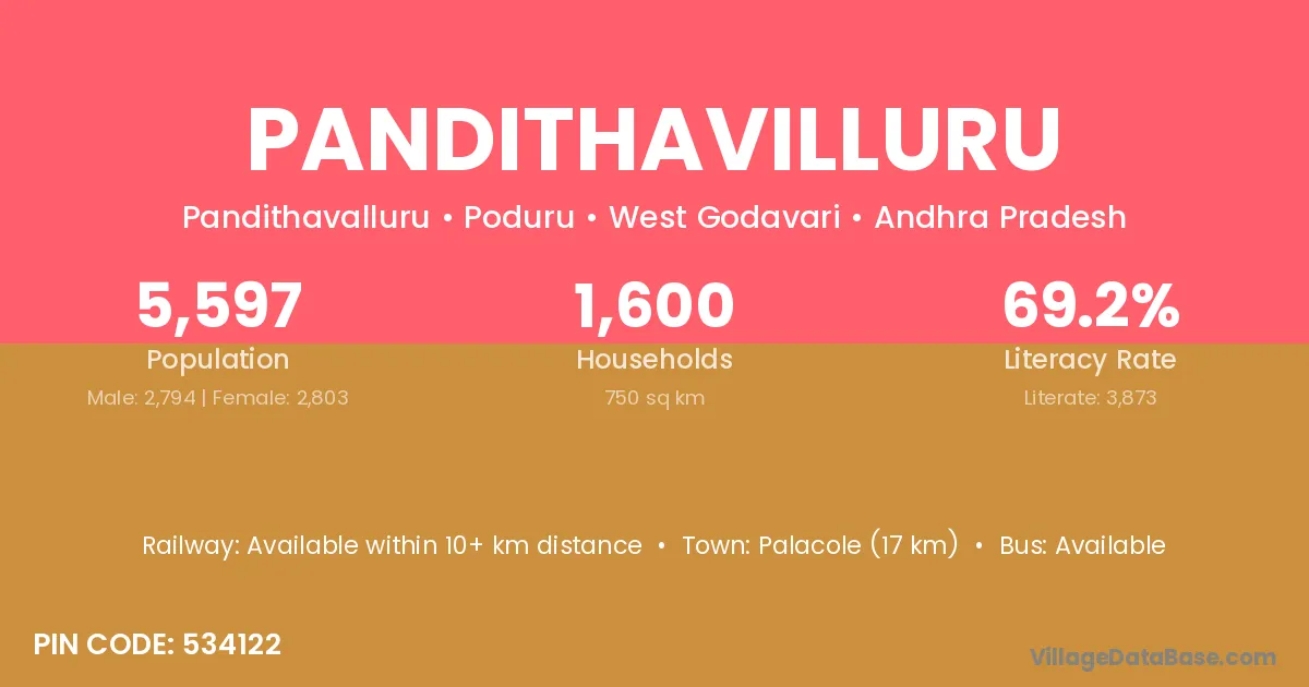 Palacole (17 km) is the nearest town to Pandithavilluru village for major economic activities and is located approximately 17 km away.