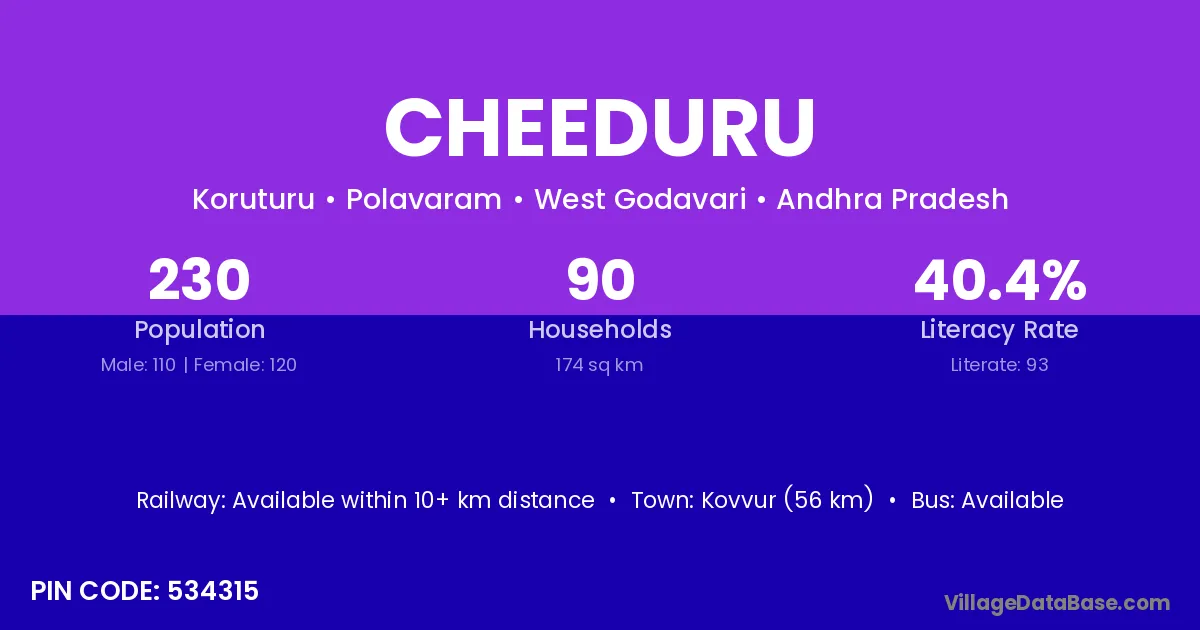 Cheeduru village has a total population of 230 people, of which 110 are males and 120 are females.