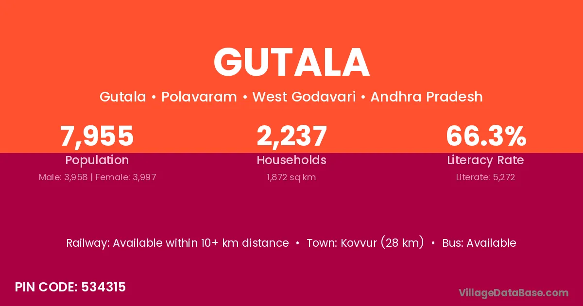Kovvur (28 km) is the nearest town to Gutala village for major economic activities and is located approximately 28 km away.