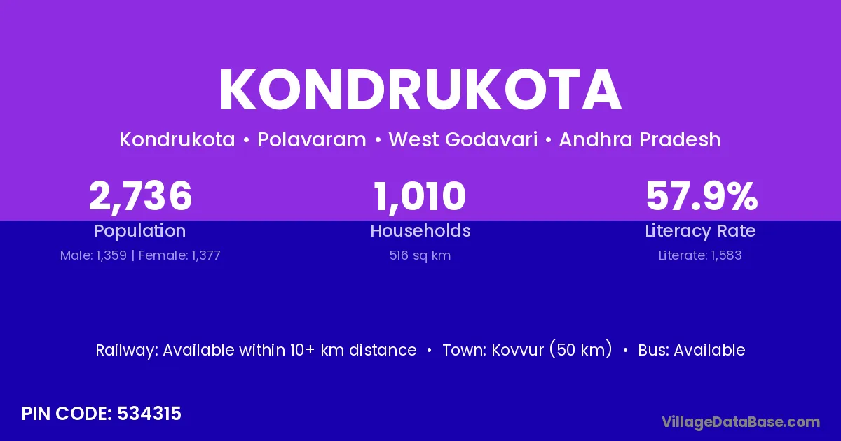 Kovvur (50 km) is the nearest town to Kondrukota village for major economic activities and is located approximately 50 km away.