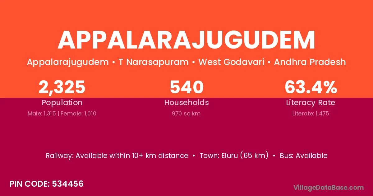 Eluru (65 km) is the nearest town to Appalarajugudem village for major economic activities and is located approximately 65 km away.