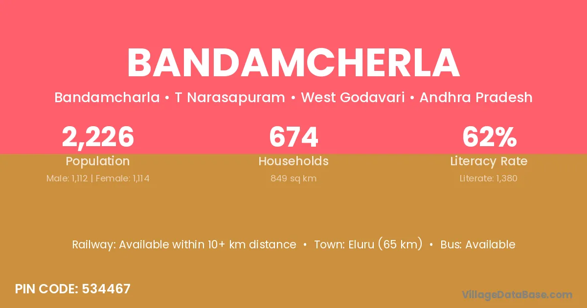Eluru (65 km) is the nearest town to Bandamcherla village for major economic activities and is located approximately 65 km away.