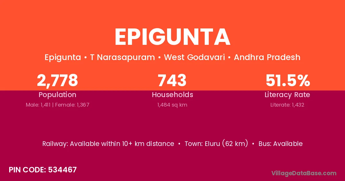 Eluru (62 km) is the nearest town to Epigunta village for major economic activities and is located approximately 62 km away.