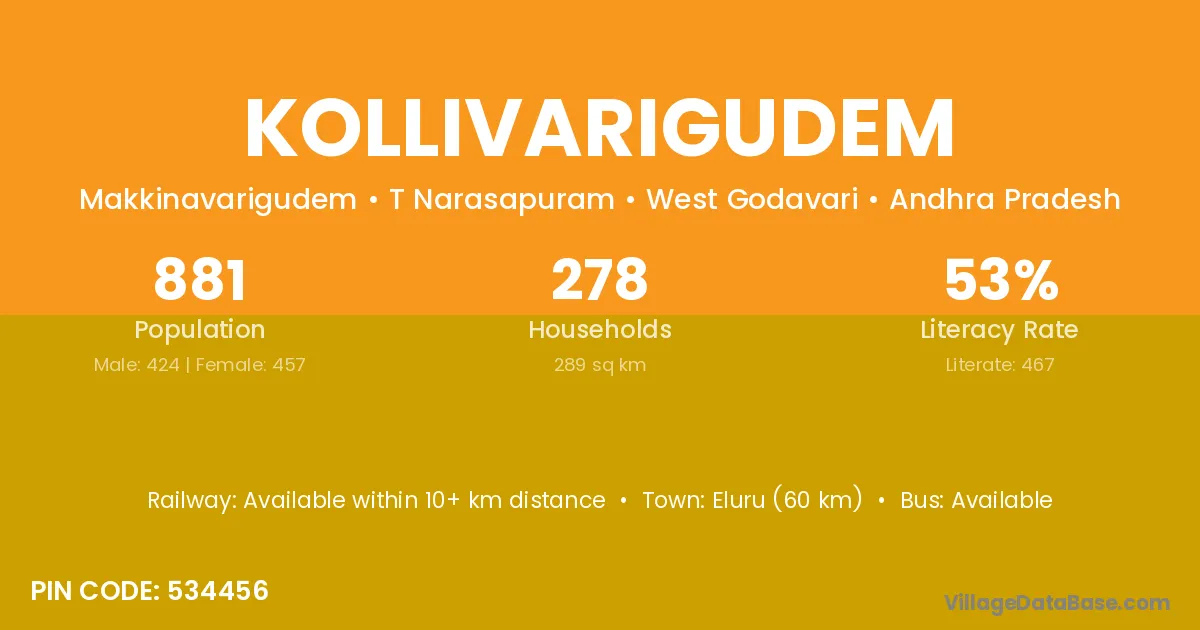 Kollivarigudem village has a total population of 881 people, of which 424 are males and 457 are females.