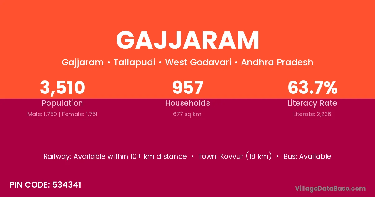 Kovvur (18 km) is the nearest town to Gajjaram village for major economic activities and is located approximately 18 km away.