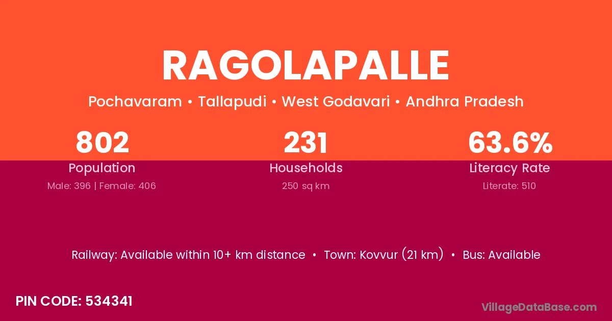 Kovvur (21 km) is the nearest town to Ragolapalle village for major economic activities and is located approximately 21 km away.